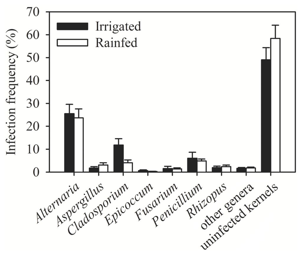 Incidence of fungal genera in wheat kernels collected from irrigated and rainfed fields. * Error bars represent the standard error of mean.