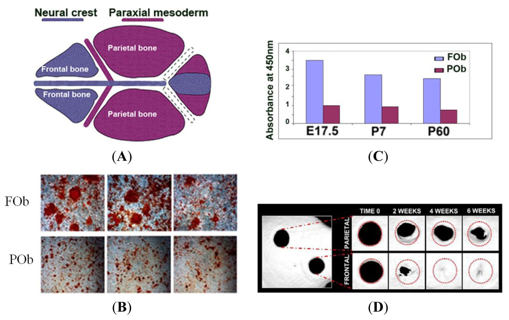 - Quarto, N.; Wan, D.C.; Kwan, M.D.; Panetta, N.J.; Li, S.; Longaker, M.T. Origin matters: Differences in embryonic tissue origin and Wnt signaling determine the osteogenic potential and healing capacity of frontal and parietal calvarial bones. J. Bone Miner Res 2010, 25, 1680–1694. [Google Scholar]