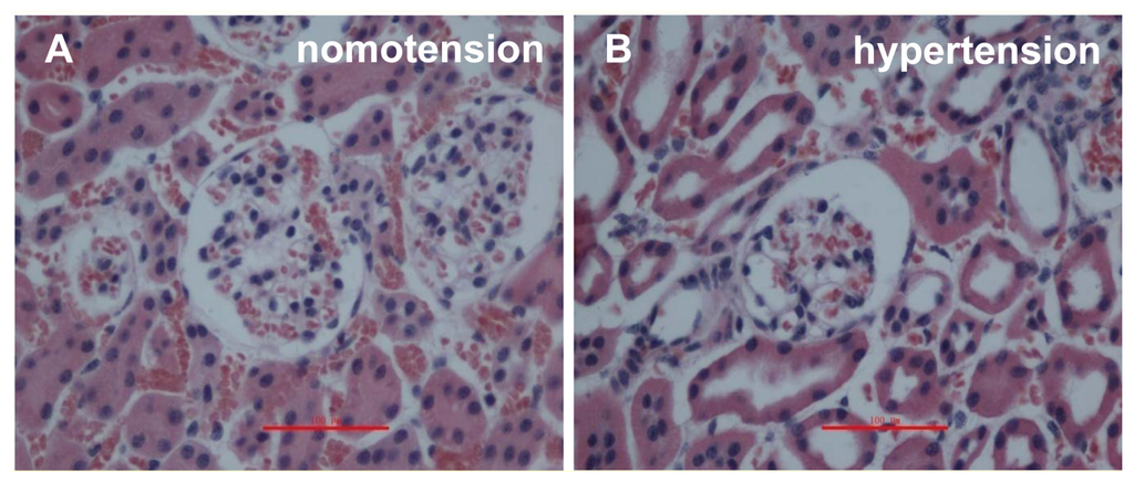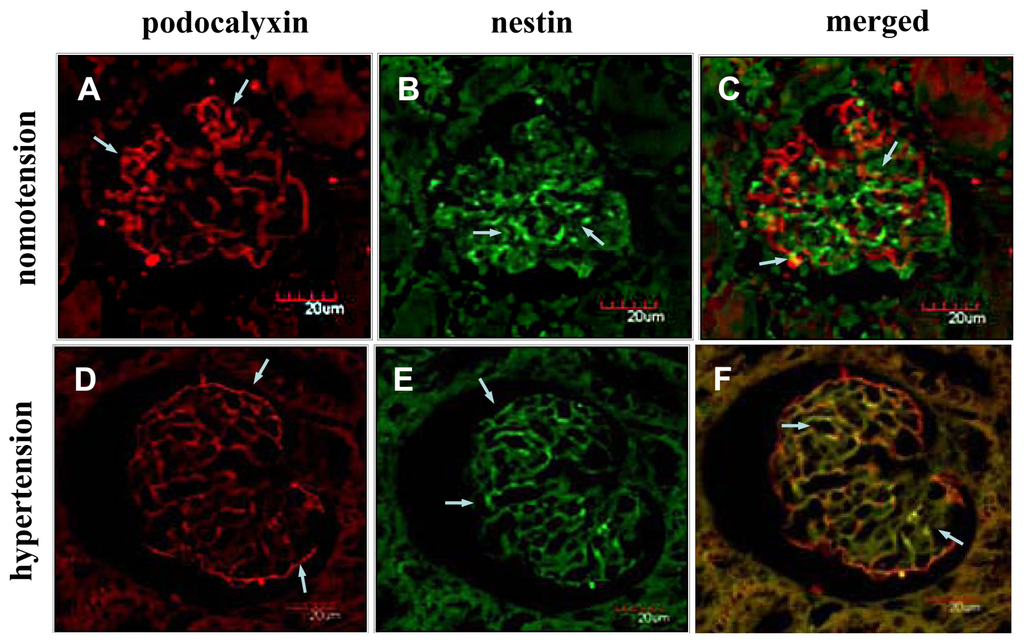 In addition, the ectopic immunolocalization of PCX and nestin in the glomeruli during acute hypertension might be attributed to the acute increased pressure in the glomeruli that occurs with the ligation of distal renal arteries branching off the aorta [16,20]. In our study, we observed the displacement of podocyte proteins during an acute hypertensive state because the higher pressures in the glomerular capillaries mechanically changed the structure of the podocytes and impaired the glomerular filtration barrier.