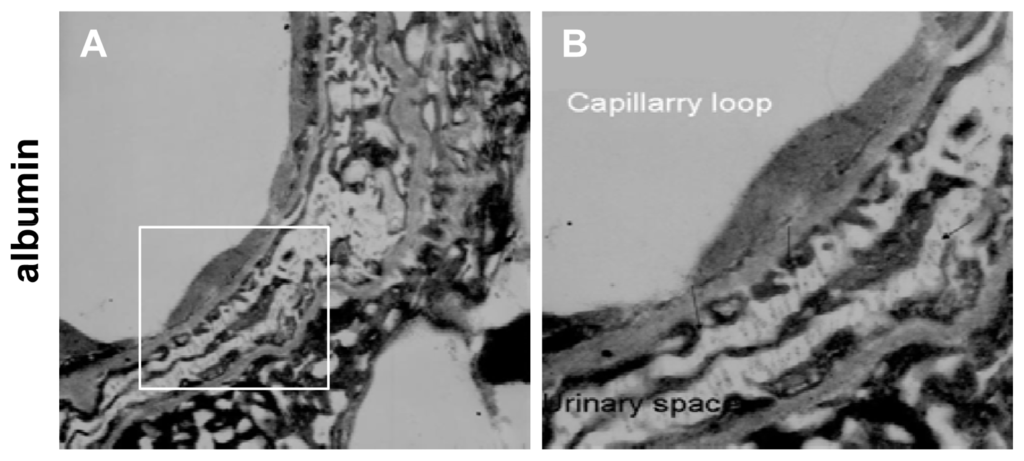 To examine the glomerular leakage of the serum proteins, albumin and IgG, under acute hypertensive conditions, we stained some sections after DAB staining with 1% osmium tetroxide acid for 20 min. The sections were then dehydrated with a graded series of ethanol and acetone and finally inversion embedded with Epon 812 polymerized at 60 °C for 48 h. The sections were cut at a 70 nm thickness and stained with uranyl acetate, and then ultrastructural images were taken with a transmission electron microscope.