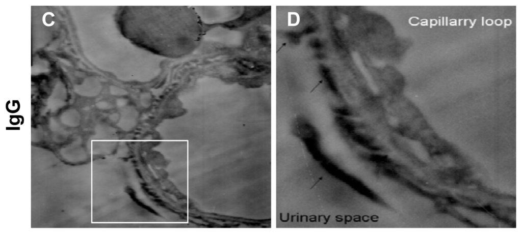 In addition, to determine the instant ultrastructural changes of GBM under acute hypertensive conditions, the immunolocalization of serum proteins in GBM was observed by immunoelectron microscopy with the IVCT specimens. Under the acute hypertensive condition, both albumin (Figure 2A,B) and IgG (Figure 2C,D) were clearly immunolocalized along the apical surface of the podocytes and Bowman’s spaces (arrows). A high glomerular blood capillary pressure mechanically caused leakage of serum proteins, which passed through the slit diaphragm and GBM.