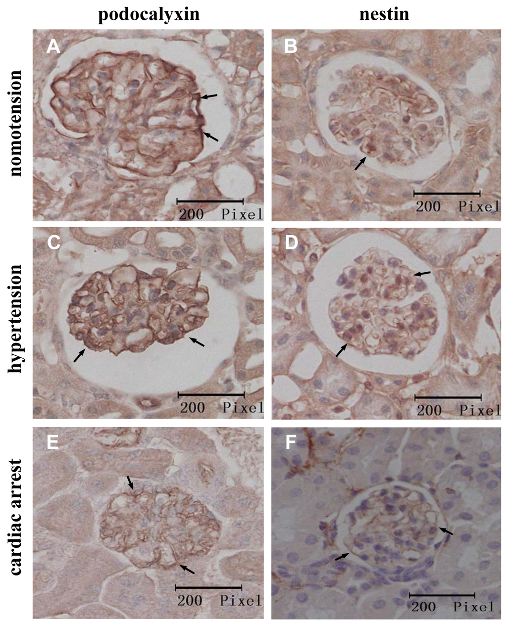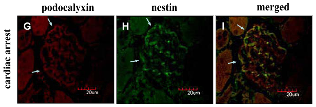 These results indicate that the acute hypertensive and cardiac arrest conditions decrease the expression of PCX and nestin and also influence the localization of these podocyte proteins.