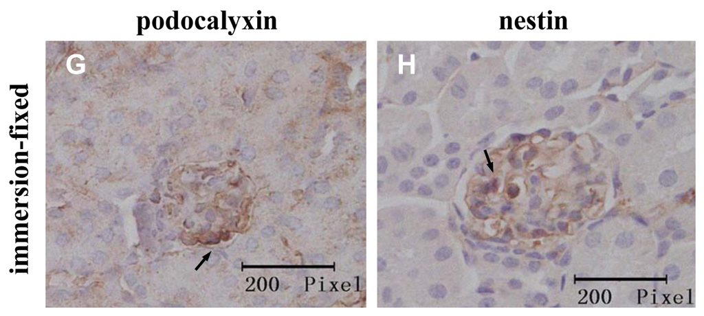Immunohistochemical localization of the podocyte proteins in kidney tissues prepared with the IVCT and immersion-fixation methods under various hemodynamic conditions. The micrographs in the left column show the localization of podocalyxin (PCX) (arrows), and those in right column show nestin localization (arrows). The immunohistochemical localization of the two proteins prepared with IVCT are shown under the normotensive (A,B), acute hypertensive (C,D), and cardiac arrest (E,F) conditions. The tissues in G and H under normotensive condition were treated by the immersion-fixation method.