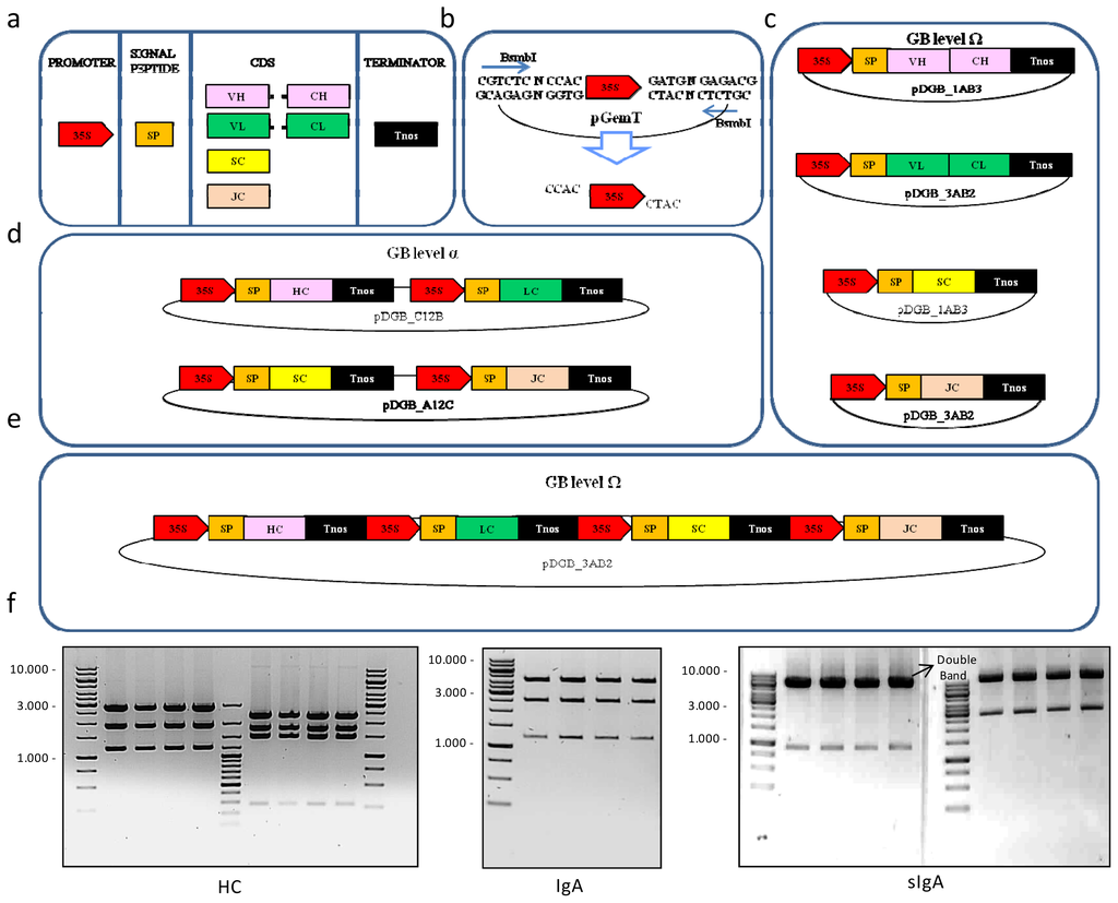 Assembly process of the secretory immunoglobulin A (sIgA). (a) Collection of basic parts necessary to construct a secretory IgA. Each basic part is cloned in a pGem-T vector. 35S, SP, VH-CH, VL-CL, SC, JC, Tnos, correspond, respectively, to the 35s CMV promoter, pectate lyase signal peptide, variable and constant regions of the heavy chain, variable and constant regions of the light chain, secretory component, J-chain and nopaline synthase terminator; (b) Example of domestication of a basic part. The 35s promoter is flanked by fixed BsmbI recognition-cleavage sites. The overhangs left by the BsmbI restriction enzyme converge with GB pDGB vectors on 5′ and on 3′, with the next basic part to assemble; (c) Multipartite assembly of the basic parts to form the four different transcriptional units: heavy chain (HC), light chain (LC), secretory component (SC) and J-chain (JC), into level Ω-GB destiny vectors (pDGB_1AB3 and pDGB_3AB2); (d) Binary assembly of transcriptional units in level α-GB destination vectors (pDGB_C12B and pDGB_A12C), in order to construct two different composite parts—IgA and JC-SC; (e) Last construct of sIgA by binary assembly of two composite parts in a final pDGB; (f) Example of restriction analysis of four colonies of each construct: left, BglII (expected bands of 2825, 1886 and 1197) and BglI (expected bands of 2345, 1790, 1498 and 275) restriction analysis of the HC transcriptional unit; middle, BglII (expected bands of 4183, 2495 and 1228 kDa) restriction analysis of IgA; right, BamHI (expected bands of 6815, 5857 and 913 kDa) and BsaI (expected bands of 10,664 + 2921 kDa) restriction analysis of sIgA.