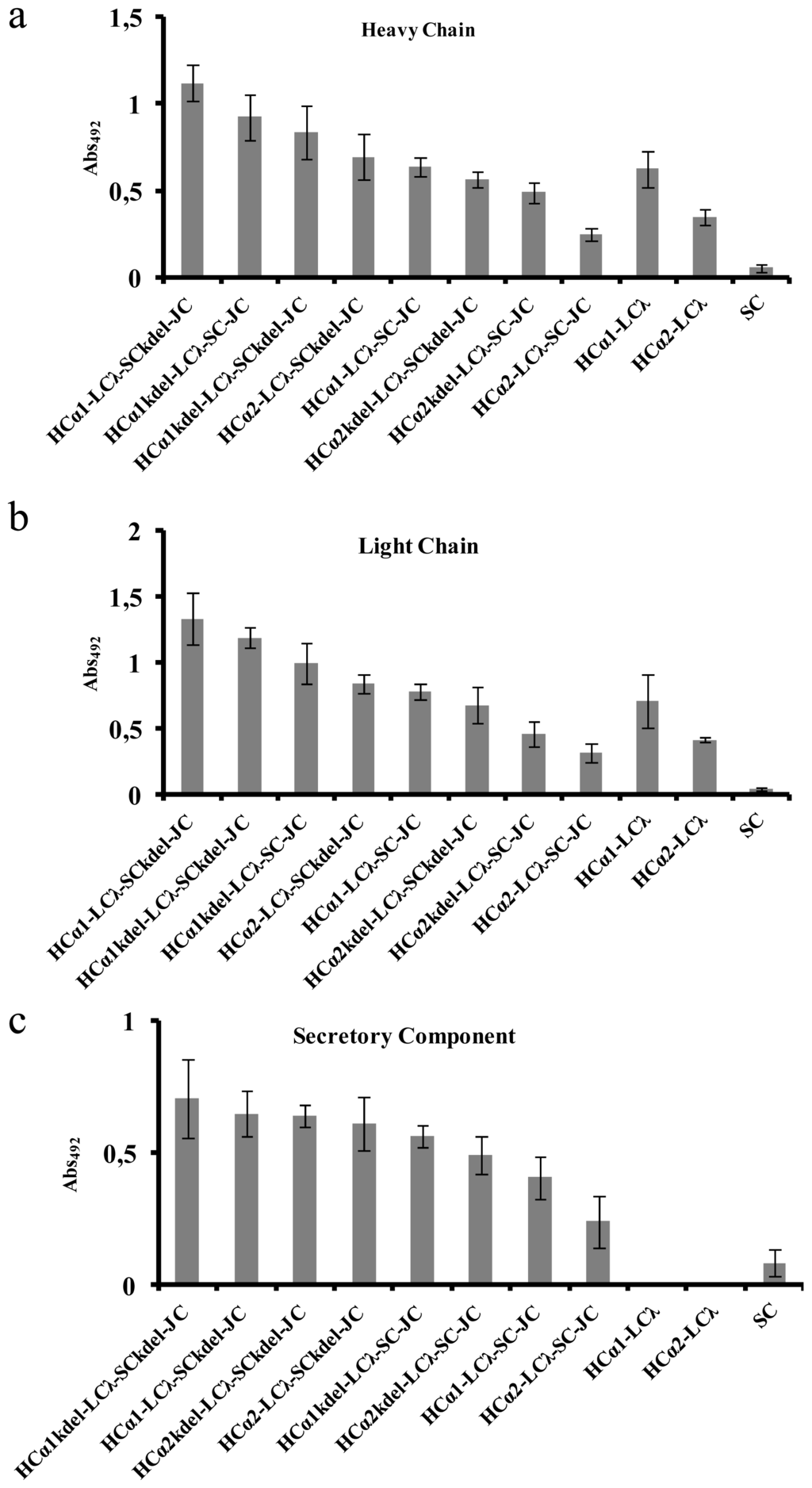 Taking into account the whole analysis, the maximum anti-VP8* activity, detected both as total IgA and sIgA, was achieved with the HCα1-LCλ-JC-SCkdel combination. Among non-ER-retained forms, the maximum anti-VP8* activity was achieved with the HCα1-LCλ-JC-SC combination (Figure 2).