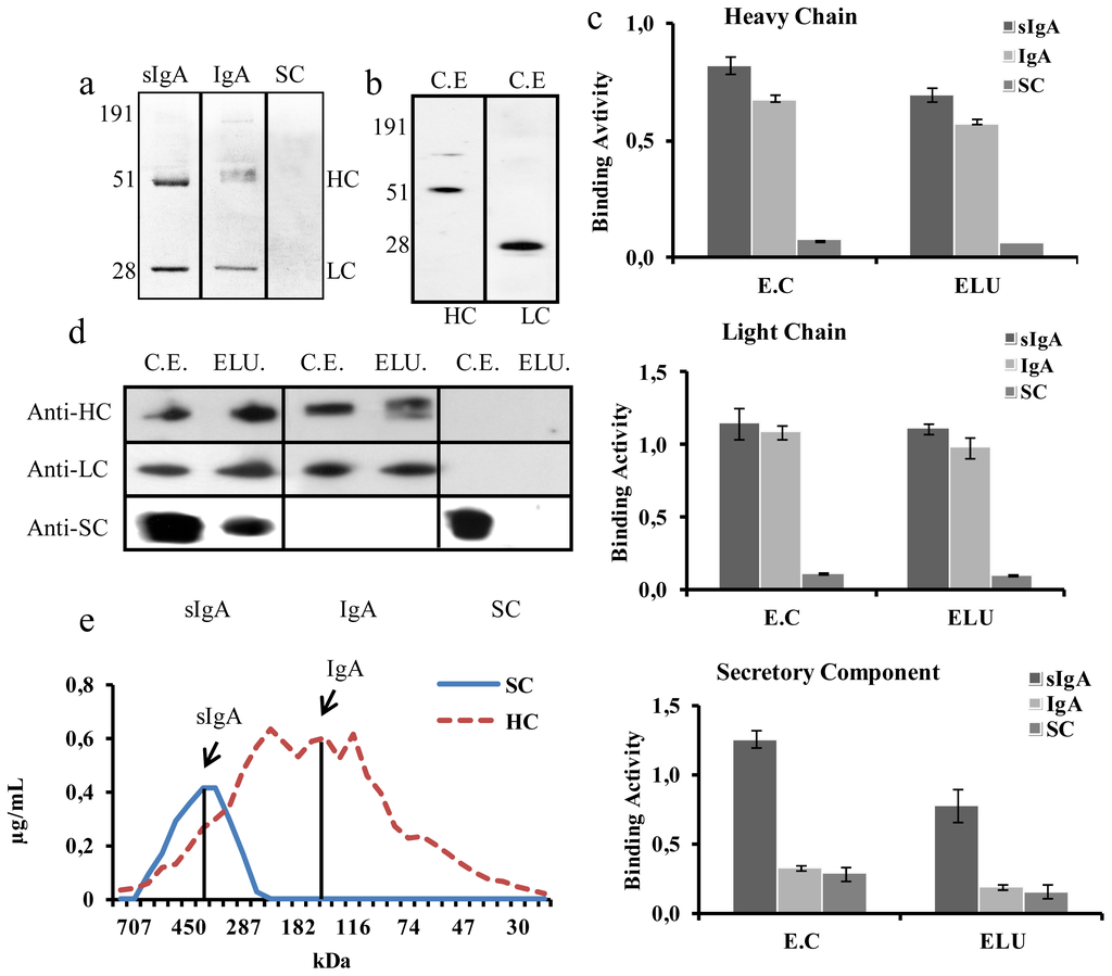 With these results and in order to learn more about the proportion of sIgA in the total IgA, a gel filtration assay was performed. For this, sIgA from the best performing combination was purified and 500 μL of the elution loaded into a prepacked high-resolution gel filtration column with a separation range between 10 and 600 kDa. Fractions of 250 μL were collected and monitored by sandwich ELISA assays developed both with anti-HC and anti-SC. Figure 3d shows two partially overlapped peaks, the larger one corresponding to the total content of HC equivalents (including sIgA (371 kDa), mIgA (146 kDa) and possibly unfolded chains) and the smaller one developed with anti-SC, corresponding to 371 kDa sIgA (an estimated 20% of the total IgA content) (Figure 3e).