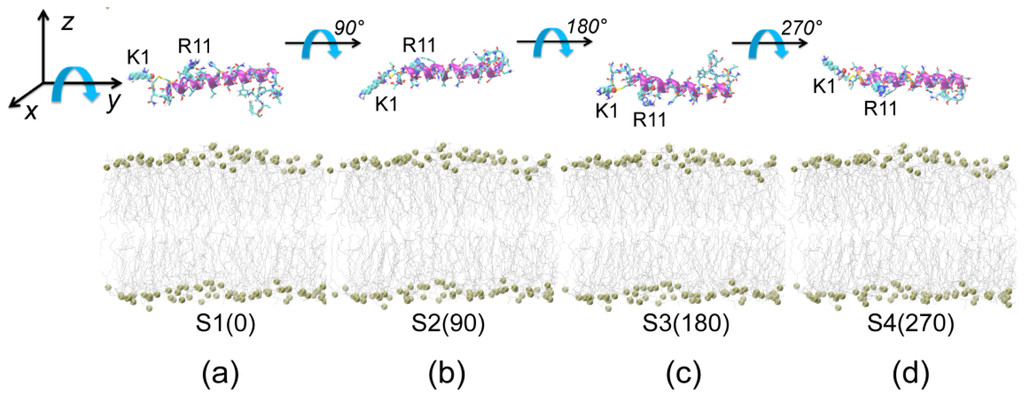 It has been reported that hIAPP is predominantly α-helical when initially bound to the membrane [–]. As the time for folding a peptide in an explicit lipid membrane is on the order of a millisecond or second, it is still out of reach to sample the conformational transition from the random coil to helical structure at physiological temperatures. Therefore, we take one of the NMR-derived conformations (pdb ID: 2KB8) solved in SDS micelles at acidic pH as the initial structure of hIAPP [], as done previously by us and others [,,]. The core of the structure is an α-helix running from residues 5–28 with a distortion or kink near residues 18–22 []. hIAPP monomer is initially placed in aqueous solution parallel to the membrane surface. To allow the peptide to adjust its orientation before adsorption to the bilayer surface, the minimum distance between hIAPP and the bilayer surface is set to be ≥1.4 nm. We choose four different starting orientations of the peptides with respect to the bilayer, and the initial states are shown in Figure 1. In the first initial state, the side chains of residues K1 and R11 point away from the membrane surface (see Figure 1a). In the second (Figure 1b), third (Figure 1c) and fourth (Figure 1d) initial states, the orientations of the peptide are generated by rotating the hIAPP peptide in Figure 1a 90°, 180° and 270° around the axis of the helix (i.e., y-axis), respectively. The four different initial states are labeled as S1(0), S2(90), S3(180) and S4(270), according to the rotation angle. The minimum distance between the N-/C-terminus and the membrane surface are given in Table 1. All of the hIAPP-membrane systems are fully solvated in a water box. Counterions (Na+) are added to neutralize the system.
