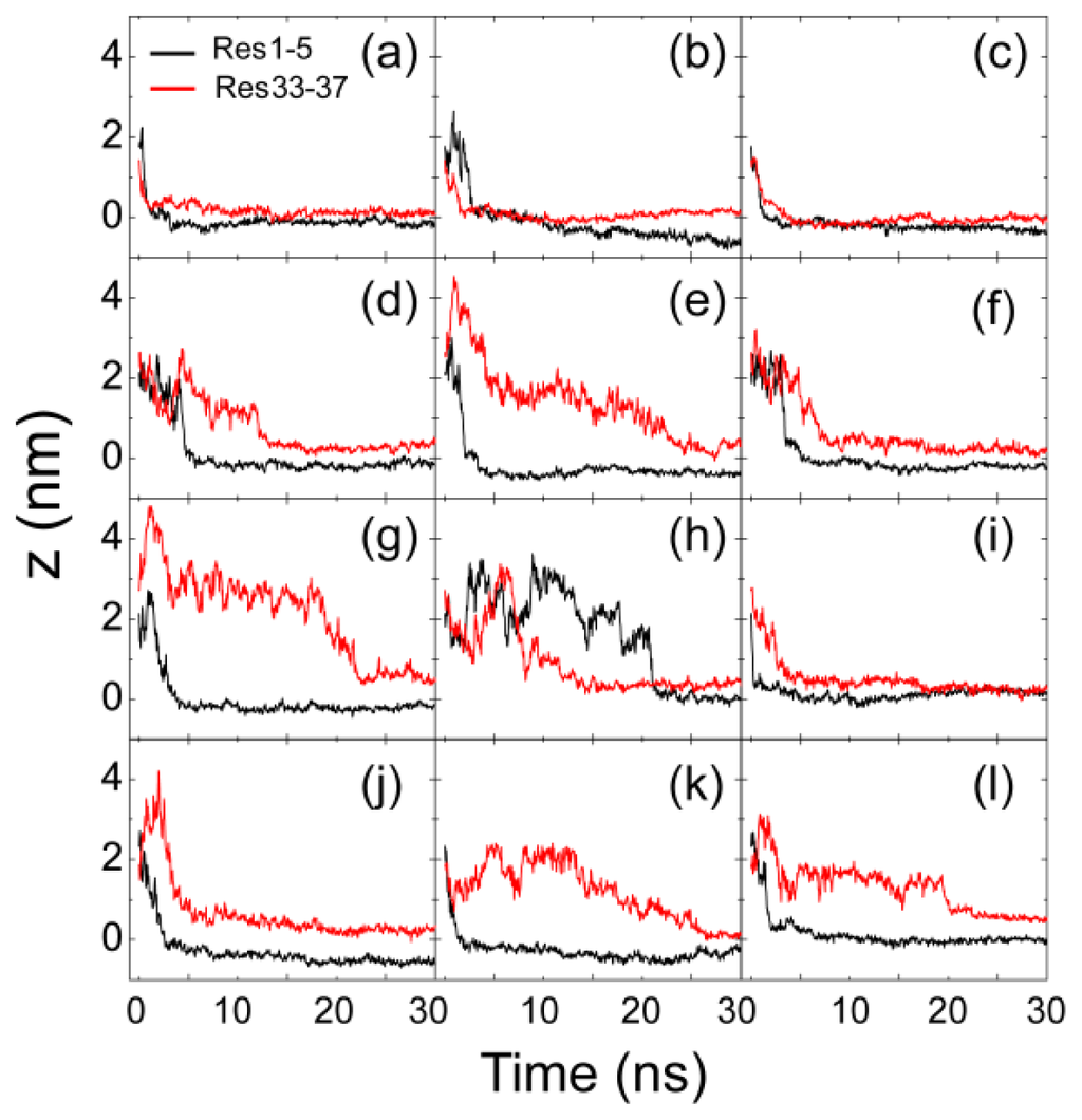 Time evolution of the minimum distance between the N-/C-terminus of hIAPP and the lipid bilayer for 12 independent molecular dynamics (MD) runs. The full simulation time is 120 ns for each MD run; for clarity, we show the first 30 ns only. The results in panels (a)–(c), (d)–(f), (g)–(i) and (j)–(l) are for the MD runs starting from S1(0), S2(90), S3(180) and S4(270), respectively. We use the minimum distance between the first/last five residues 1–5/33–37 (labeled as Res1–5/Res33–37) and the lipid bilayer to describe the distance between the N-/C-terminus and the bilayer surface.