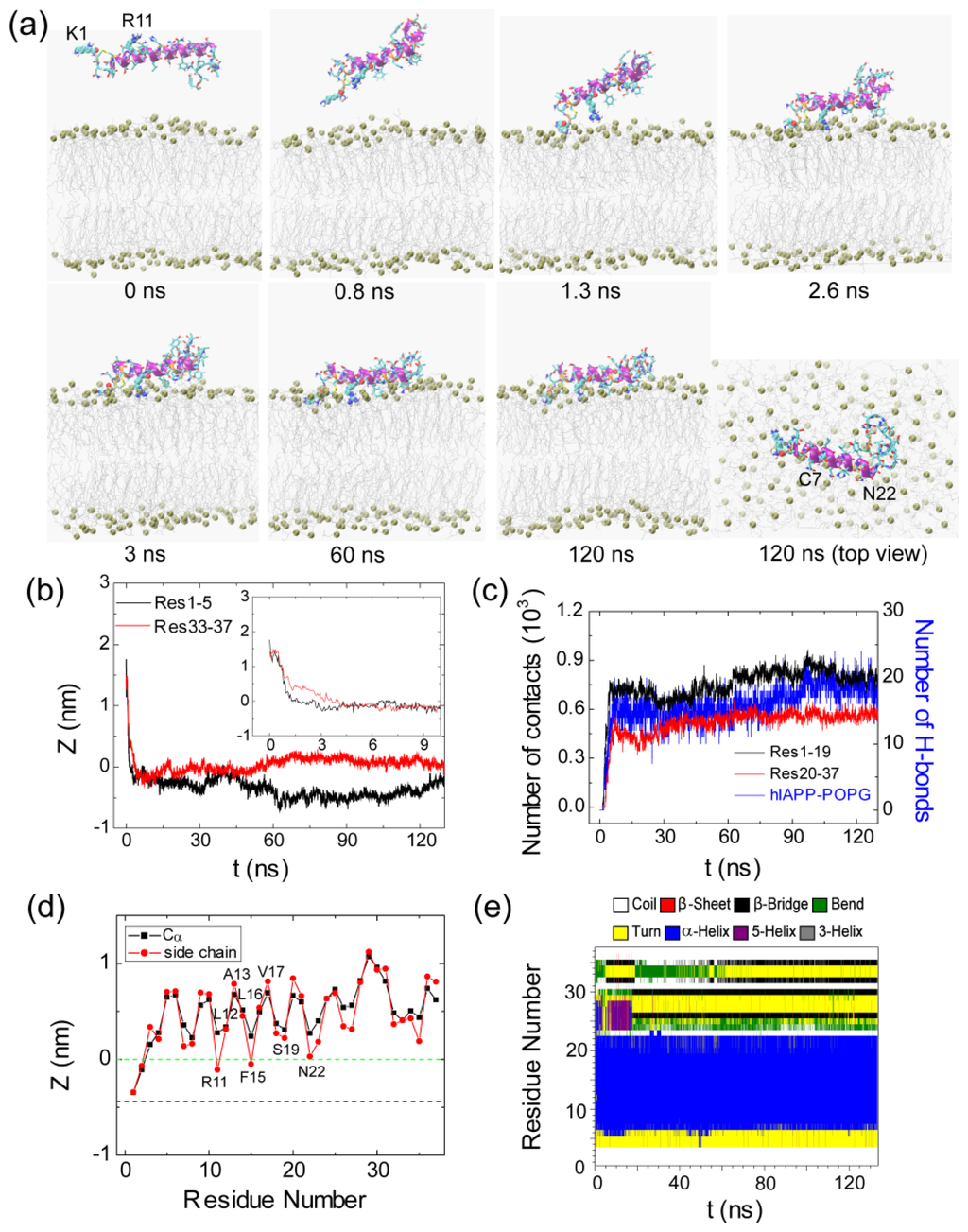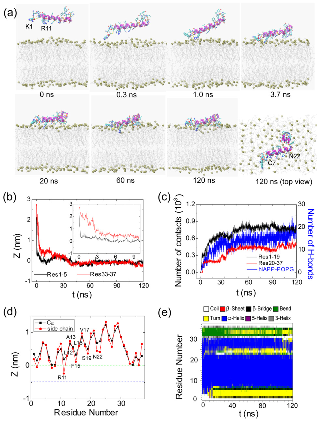 Detailed analysis of a representative MD trajectory starting from initial state S3(180). (a) Snapshots at seven different time points and the top view of the snapshot at t = 120 ns. Each snapshot is displayed using the same representations as those used in Figure 1; (b) Time evolution of the minimum distance between the N-/C-terminus of hIAPP and the lipid bilayer. In order to show clearly the initial adsorption process, we give the time evolution of the distance within the first 10 ns in the inset; (c) Time evolution of the number of contacts between N-/C-terminal residues 1–19/20–37 (Res1–19/Res20–37) and the POPG bilayer and the number of hydrogen bonds formed between hIAPP and POPG lipids; (d) The time-averaged (last 20 ns) z-positions of the Cα atom (blue) and the side chain centroid (red) as a function of residue number. The dotted green and blue lines correspond to the headgroup phosphorus atom and the first carbon atom in the lipid tail of the sn-1 chain, respectively; (e) The secondary structure profile of hIAPP.