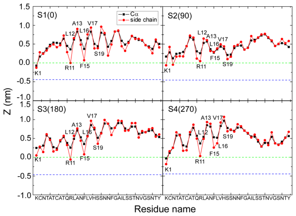 The z-positions of the Cα atom (blue) and the side chain centroid (red) of each residue. The results are for four different systems, S1(0), S2(90), S3(180) and S4(270). For each system, the z-position is an average of three different MD runs using the last 20 ns data. The dotted green and blue lines correspond respectively to the headgroup phosphorus atom and the first carbon atom in the lipid tail of the sn-1 chain. The region between the two lines is the headgroup region of the POPG bilayer. We observe that simulations with different starting orientations of the peptides relative to the bilayer surface lead to a similar binding orientation, with residues R11, F15 and S19 oriented toward the POPG bilayer surface.