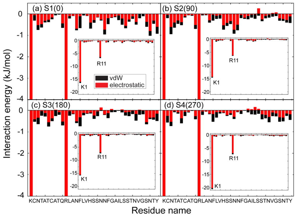 The interaction energy of each individual residue of hIAPP with POPG lipids (per lipid). The results are for four different systems, S1(0), S2(90), S3(180) and S4(270). For each system, the interaction energy is averaged over the last 20 ns of three MD runs. The residue-based interaction energy is decomposed into electrostatic and van der Waals (vdW) terms.