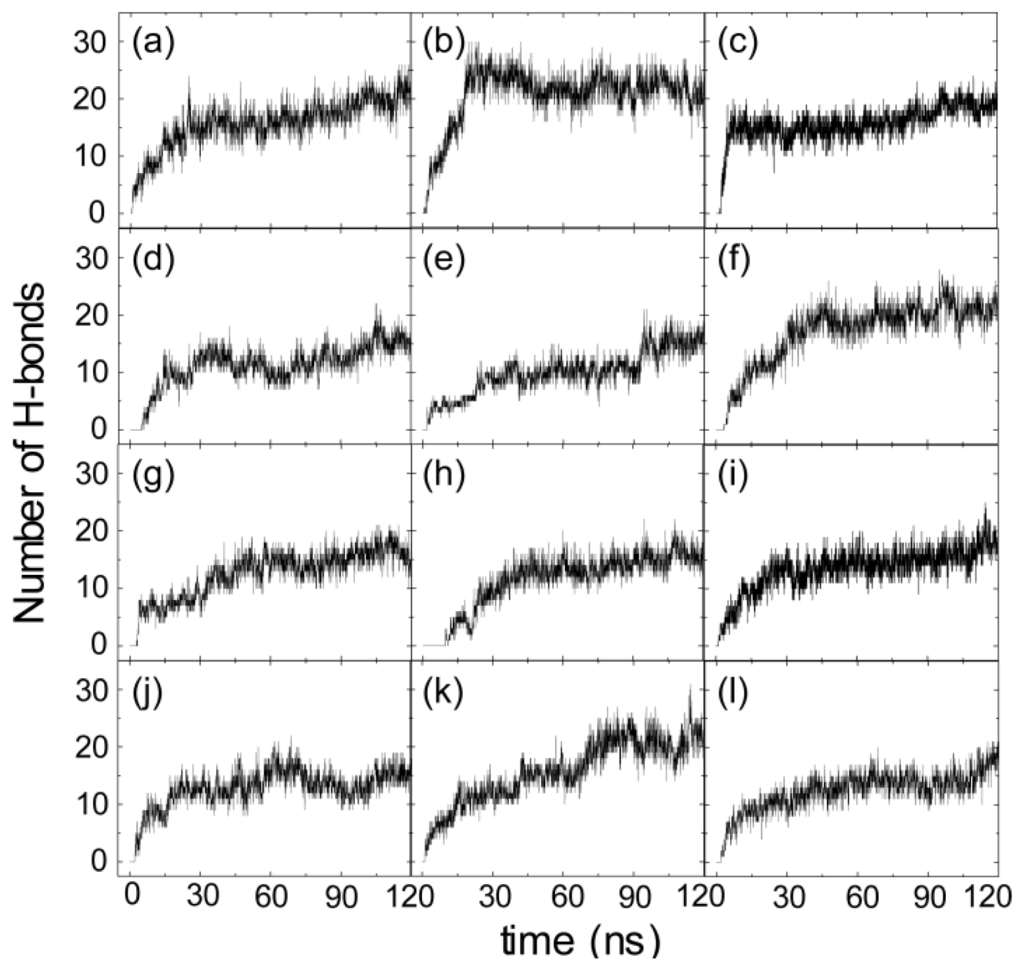 Time evolution of the number of hydrogen bonds formed between hIAPP peptide and POPG lipid for12 MD runs. The results in panels (a)–(c), (d)–(f), (g)–(i) and (j)–(l) are for the MD runs starting from S1(0), S2(90), S3(180) and S4(270), respectively.