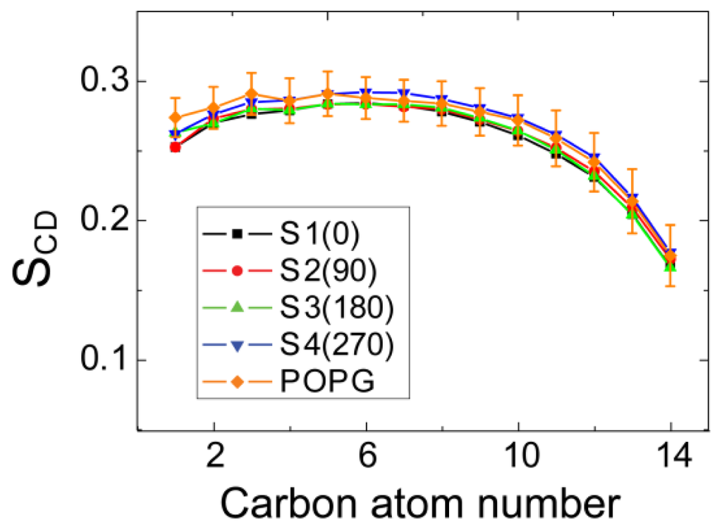 Order parameter, SCD, of lipid tails (sn-1 chain) for all of the systems. The order parameter is averaged over the last 20 ns of three MD runs for each system. For comparison, we also give the SCD of the sn-1 chain obtained from the last 20 ns of a 100 ns MD run for pure POPG lipid bilayer.