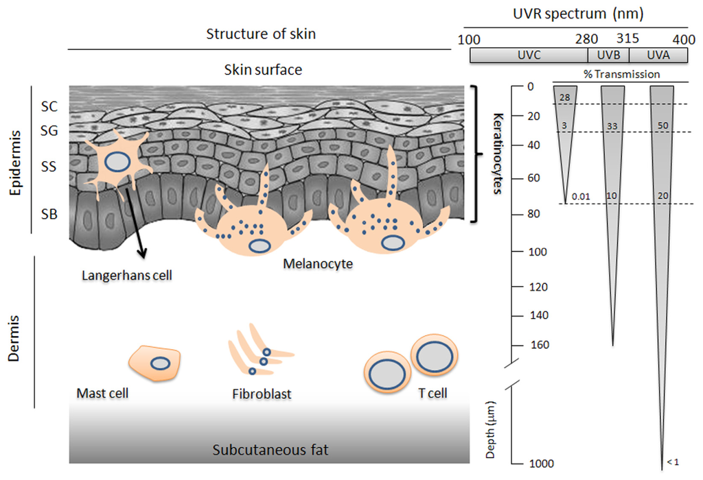 Depending on the wavelength, UVR (100–400 nm) can be divided into three parts—UVA (315–400 nm), UVB (280–315 nm), and UVC (100–280 nm) []. UVC has the shortest wavelength and the highest energy, although most of the solar UVC is blocked by the ozone layer. The maximum absorption spectrum of DNA (260 nm) lies in the UVC spectrum. Thus, UVC is most harmful to genetic integrity, but it seldom reaches human skin due to its absorption by ozone layers. UVA has the longest wavelength with the lowest energy and can penetrate deeply into the dermis and cause aging effects []. UVB, which has a wavelength spectrum in between UVC and UVA, can cause redness of the skin and contribute to most of the UVR entering the dermis. Since UVB is only partially blocked by clouds or fog, UVB radiation is considered as the main cause of sunburn and skin cancers []. In fact, both UVB and UVA radiation contribute to freckling, skin wrinkling and the development of skin cancers [,]. Since the skin is composed of different layers of varying depths with different physical and chemical properties, UVR exerts different biological effects on different kinds of cells in the skin (Figure 1).