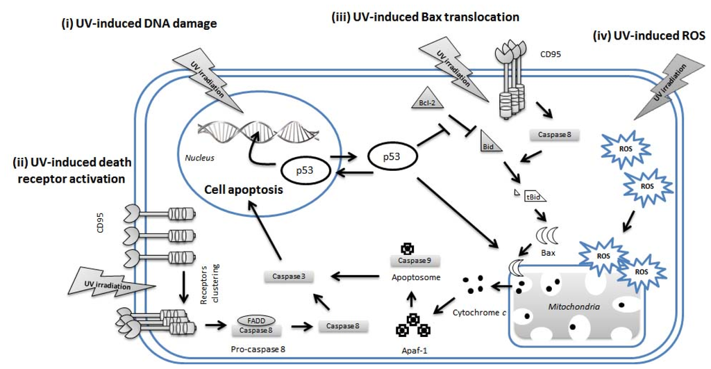 Mechanisms of UV-induced apoptosis. (i) UV induces DNA damages followed by p53 activation and leakage of cytochrome c from mitochondria; (ii) UV can also activate and cluster several cell membrane death receptors (extrinsic pathway), leading to activation of caspase cascade and apoptosis; In addition, (iii) UV-induced death receptor activation can further promote the Bax translocation to mitochondria, leading to the release of cytochrome c. Moreover, (iv) UV can induce overproduction of reaactove oxygen species (ROS), not only damaging several crucial structural and functional proteins and DNA, but also exerting the release of cytochrome c from impaired mitochondria.