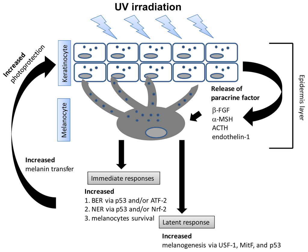 Physiological UVR dose induces activation of the transcription factors USF-1, Mitf, ATF-2, Nrf-2 and p53, and inhibition of NFkB. Similar as in keratinocytes, UV induces cell cycle arrest, activation of antioxidant and DNA repair pathways, and regulation of apoptotic pathways, to ensure melanocyte genomic integrity and survival in melanocytes.