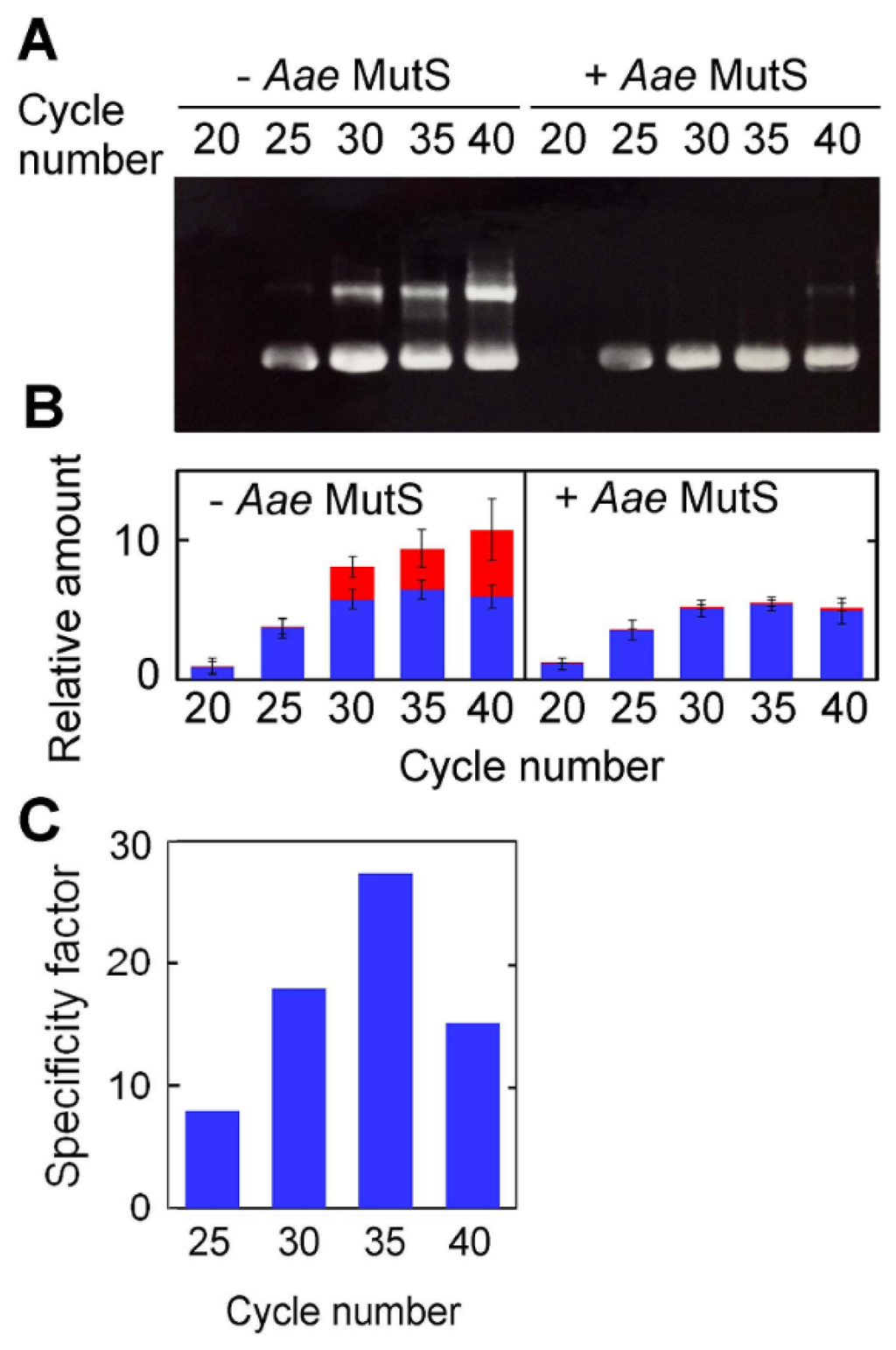 AaeMutS activity was tested by amplification of the 423-bp sequence over 20–40 cycles in the presence or absence of 0.4 μM