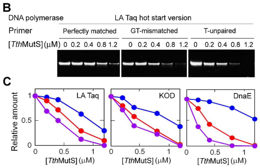 TthMutS also prevents elongation to the 5′ end of the template, generating incompletely extended DNA fragments, which leads to unstable hybridization between the primers and the template at the next cycle.