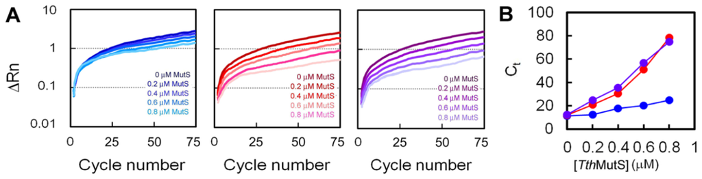 TthMutS specifically increased the threshold cycle for the amplifications from mismatched templates, which showed good concordance with the results of the standard PCR experiments.