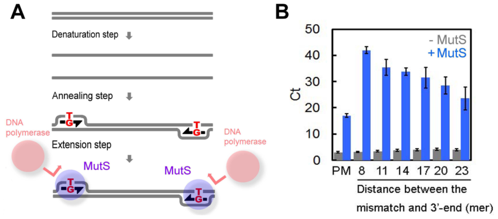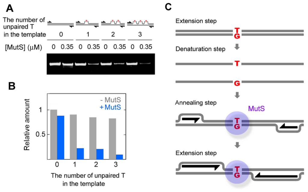 16]. This technique was shown to detect SNPs accurately, but it remained unclear whether it could be applied to PCR. Moreover, the possibility that MutS could suppress nonspecific amplification in addition to mutations during PCR had not been conceptualized at that time.