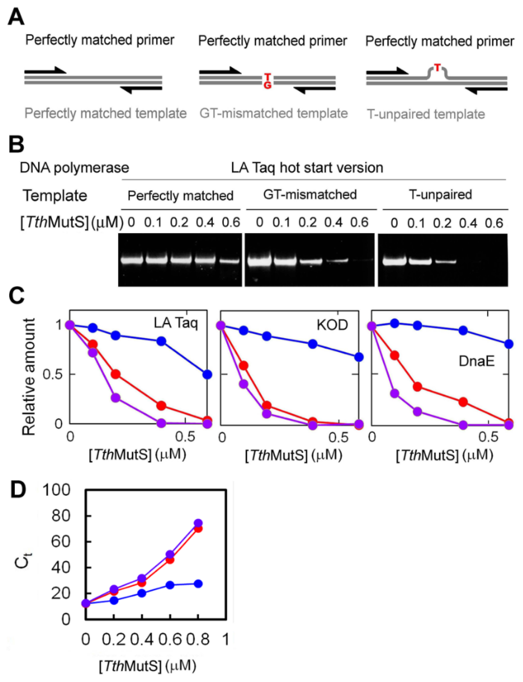 We next tested the ability of MutS to inhibit amplification from GT-mismatched or T-unpaired templates (