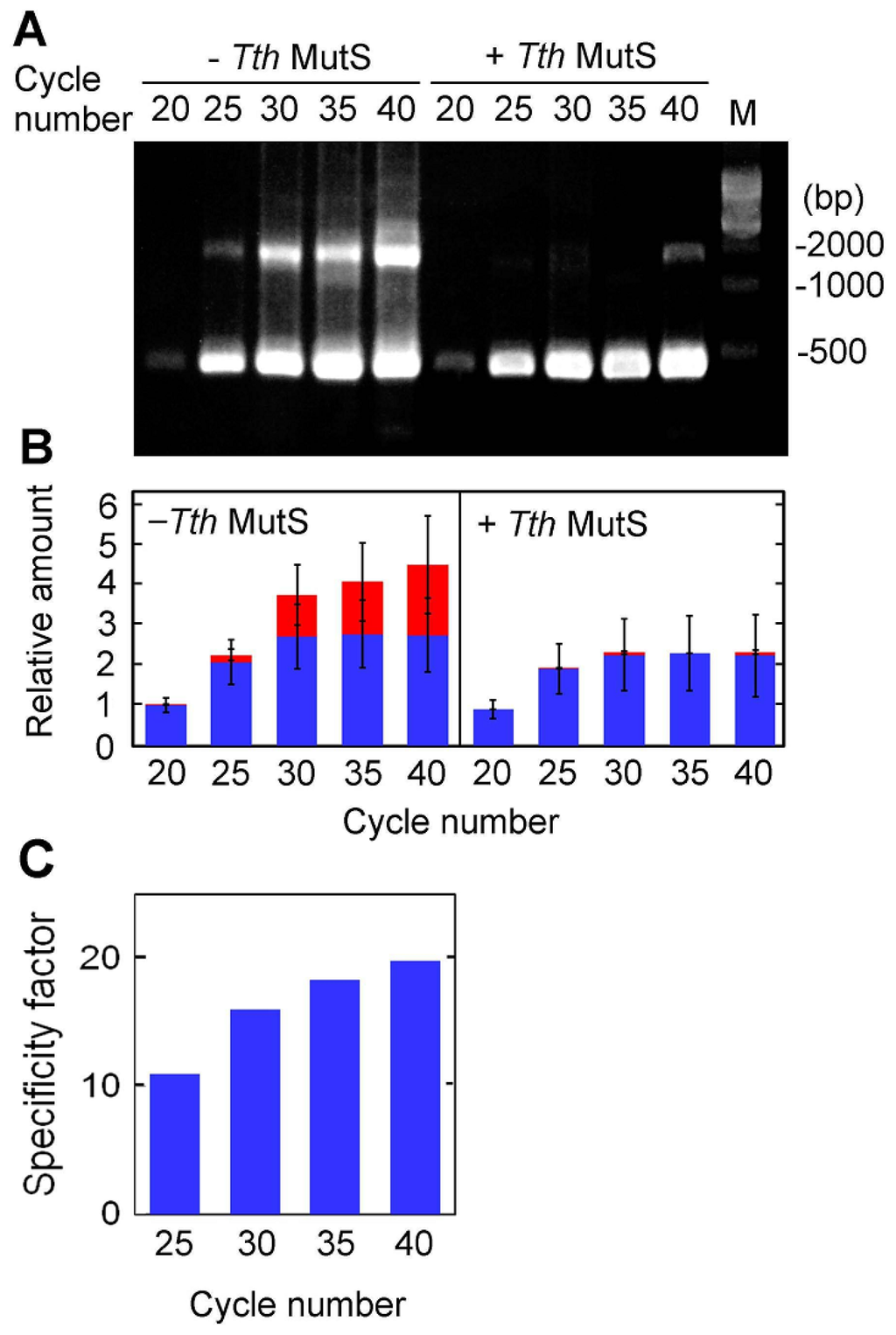 TthMutS error-suppressing activity by amplifying the 423-bp sequence for 20, 25, 30, 35 or 40 cycles in the presence of 1.1 μM