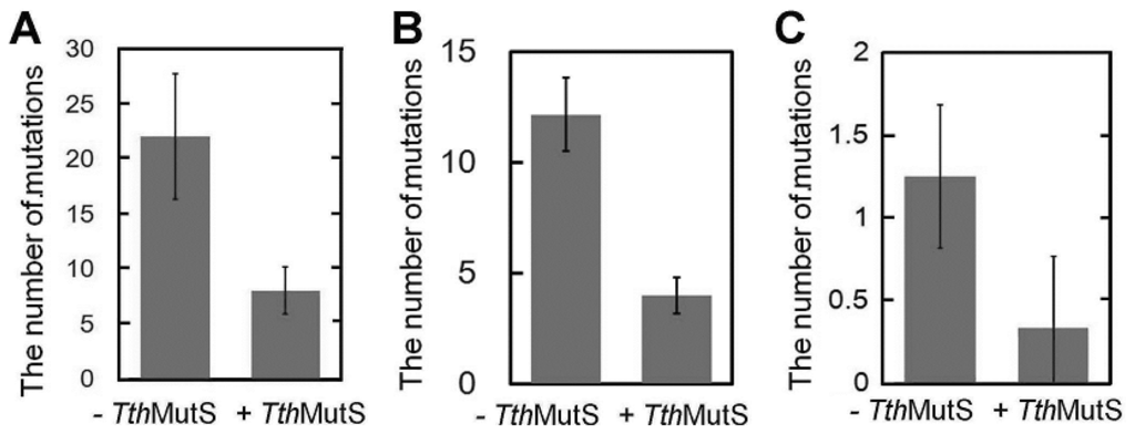 TthMutS reduced the frequency of polymerase-generated mutations by approximately two-thirds (