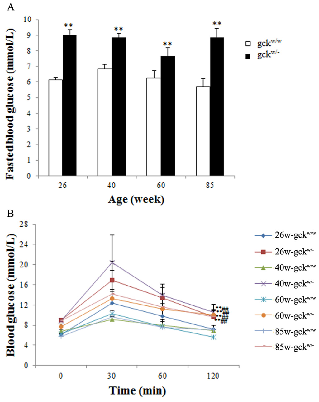 Fasting blood glucose (A) and intraperitoneal glucose tolerance tests (IPGTT) curves (B) in gckw/− and gckw/w at different ages. Data represent the mean ± SD. (n = 6). (A) ** p < 0.01 vs. age-matched gckw/w mice; (B) ** p< 0.01 vs. age-matched gckw/w mice at 0 min; ##p < 0.01 vs. age-matched gckw/w mice at 120 min.