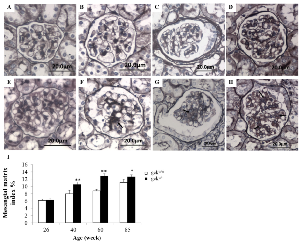 Progression of renal damage in the kidney of gckw/− mice. Glomerular histology of gckw/w mice at 26, 40, 60 and 85 weeks of age (A, B, C and D, respectively), and gckw/− mice at 26, 40, 60, 85 weeks of age (E, F, G and H, respectively) (six mice (n = 6) were examined for each group, with representative slides shown). Tissue was stained with periodic acid-silver methanamin (PASM) with a magnification of ×400. Arrows indicate areas with accumulation of mesangial matrix. I: Mesangial matrix index of mice was calculated to quantify differences with age in the gckw/− and gckw/w mice. * p < 0.05, ** p < 0.01 vs. age-matched gckw/w mice.