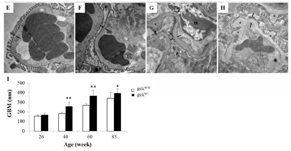 Electron photomicrographs showing age-related growth of glomerular basement membrane (GBM) thickness in gckw/− mice. Electron photomicrographs from gckw/w mice (A, B, C and D for 26, 40, 60 and 85 weeks of age, respectively) and gckw/− mice (E, F, G and H for 26, 40, 60 and 85 weeks of age, respectively) (six mice (n = 6) were examined in each group, with three glomeruli examined per mouse; representative images shown). Magnification is ×12,000. Opposing paired double arrows indicate the GBM. M, E, and P designate mesangial cells, endothelial cells, and podocytes, respectively. * Indicate prominent irregularities in the basement membrane. I: Quantification of the GBM thickness. * p < 0.05, ** p < 0.01 vs. age-matched gckw/w mice.
