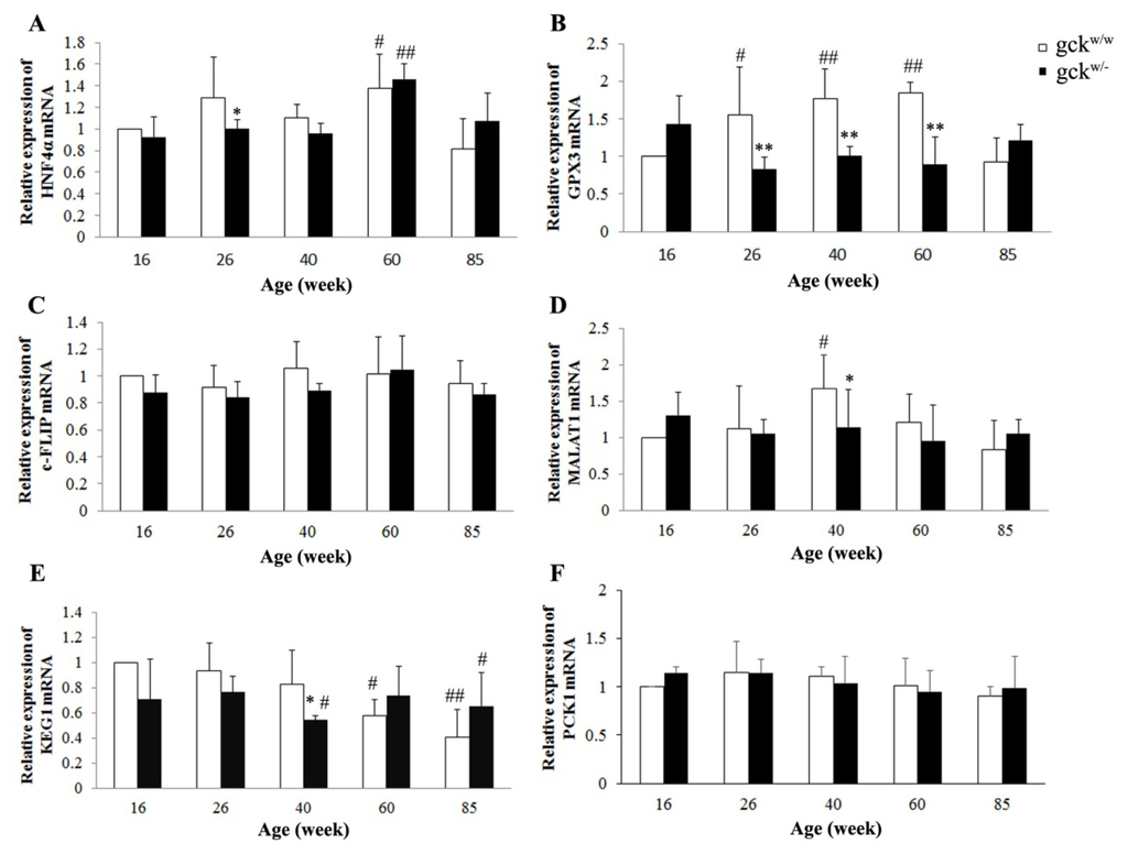 Expression levels of six candidate genes in gckw/− and gckw/w as they age. Expression levels of (A) hepatic nuclear factor 4 alpha (HNF4α); (B) glutathion peroxidase-3 (GPX3); (C) cellular FLICE-like inhibitory protein (c-FLIP); (D) metastasis associated lung adenocarcinoma transcript 1 (MALAT1); (E) kidney expressed gene 1 (KEG1) and (F) phosphoenolpyruvate carboxykinase 1 (PCK1) mRNA levels were examined in the kidney of gckw/− and gckw/w mice at different ages by qPCR. Data represent mean ± SD. (n = 6). * p < 0.05, ** p < 0.01 vs. age-matched gckw/w mice. #p < 0.05, ##p < 0.01 vs. 16 weeks gckw/w mice.