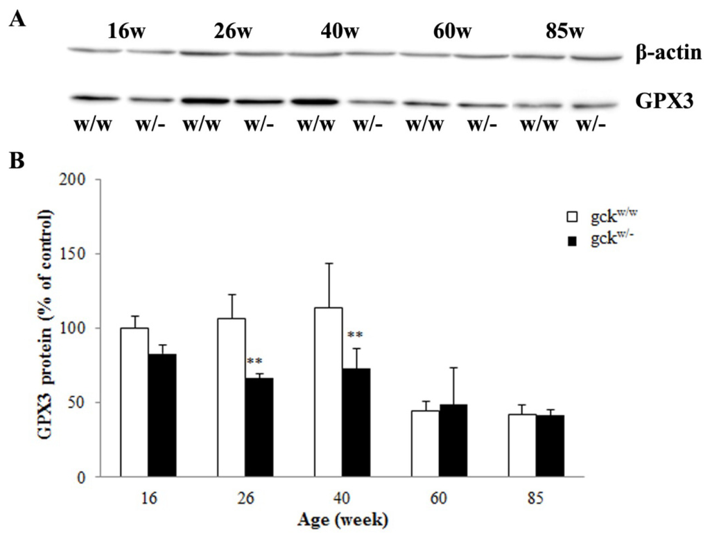 Western blot analysis of GPX3 in the kidney of gckw/− and gckw/w mice at different ages. (A) Abundance of GPX3 and β-actin protein extracted from the kidneies of gckw/− (w/−) and gckw/w (w/w) mice at 16 (16W), 26 (26W), 40 (40W), 60 (60W) and 85 (85W) weeks of age was assayed by western blot. β-actin is used as a loading control; (B) Quantification of the western blot analysis. Protein levels are compared to that of GPX3 in 16-week-old gckw/w mice (100%) and have been normalized to the β-actin levels. Data represent the mean ± SD. (n = 6). ** p < 0.01 vs. age-matched gckw/w mice.