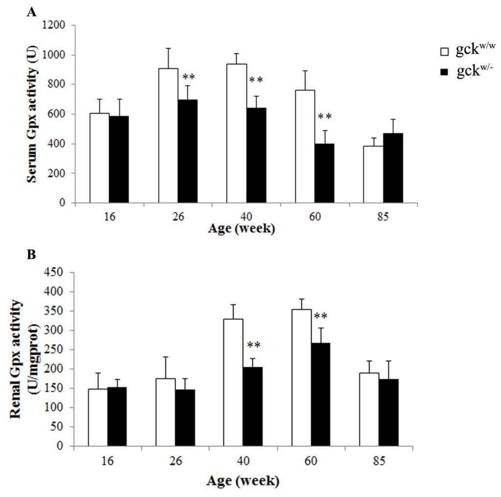 Gpx activities in the serum and kidneys of gckw/− and gckw/w mice at different ages. (A) Serum and (B) renal Gpx activities were measured in gckw/− mice and gckw/w mice at 16, 26, 40, 60 and 85 weeks of age. Data represent mean ± SD. (n = 6). ** p < 0.01 vs. age-matched gckw/w mice.