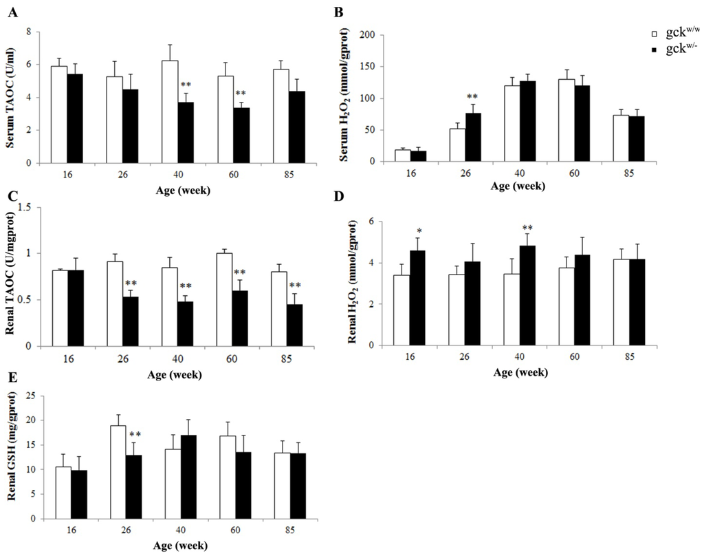 Change in oxidative stress in the serum and kidneys of gckw/− and gckw/w mice as they age. Levels of (A) serum total antioxidant capacity (TAOC); (B) serum hydrogen peroxide (H2O2); (C) renal TAOC; (D) renal H2O2 and (E) renal glutathione (GSH) in gckw/− mice and gckw/w mice at 16, 26, 40, 60 and 85 weeks of age. Data represent mean ± SD. (n = 6). * p < 0.05, ** p < 0.01 vs. age-matched gckw/w mice.