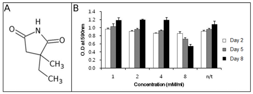 Structure of ethosuximide and cytotoxicity to rMDSCs. (A) The structure of ethosuximide, which is chemically designated as α-ethyl-α-methyl-succinimide (3-ethyl-3-methyl-pyrrolidine-2,5-dione; (B) Ethosuximide cytotoxicity was measured by the MTT assay. rMDSC neurogenesis was induced by treatment with 25 ng/mL bFGF for 24 h, and the medium was then replaced with medium containing the indicated concentrations of ethosuximide. MTT assays were performed after a total of 2, 5, or 8 days incubation.