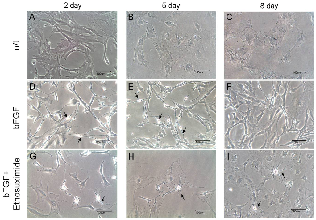 In this study, we investigated the neural differentiation potential of rat MDSCs (rMDSCs) treated with basic fibroblast growth factor (bFGF) and ethosuximide. Several studies have demonstrated that bFGF can induce neural differentiation of stem cells derived from distinct mesenchymal tissues, including endometrial [15] and adipose [16] tissues. Ethosuximide is a small heterocyclic ring compound of the succinimide class and is used clinically to treat absence seizures in humans [17]. The compound primarily acts by blocking T-type voltage-gated calcium channels in thalamic neurons [18]. To the best of our knowledge, this is the first evidence that ethosuximide induces neurogenesis of rMDSCs in vitro, suggesting that ethosuximide might be useful in inducing neural differentiation of human MDSCs.