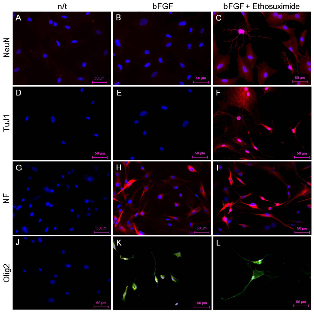 The effect of ethosuximide treatment on lineage-specific differentiation of rMDSCs in culture was monitored by immunocytochemical detection of the neuronal markers NeuN and TuJ1, the oligodendrocyte marker Olig2, and the neurofilament marker NF-MH. These neural markers were not detected in rMDSCs cultured in the absence of bFGF and ethosuximide (Figure 3A,D,G,J). The rMDSCs stimulated with bFGF alone contained cells expressing NF and Olig2 but not NeuN or TuJ1 (Figure 3B,E,H,K). However, treatment with both bFGF and ethosuximide induced rMDSCs to differentiate into cells expressing NeuN, TuJ1, and NF (Figure 3C,F,I) and Olig2 (Figure 3L), indicating the presence of neuronal lineage and oligodendrocyte lineage cells, respectively. Notably, a larger proportion of cells in these cultures expressed NeuN and TuJ1 than Olig2. These results therefore suggest that rMDSCs treated with ethosuximide differentiated mainly into cells with neural-like characteristics, implying that ethosuximide may stimulate neural differentiation.