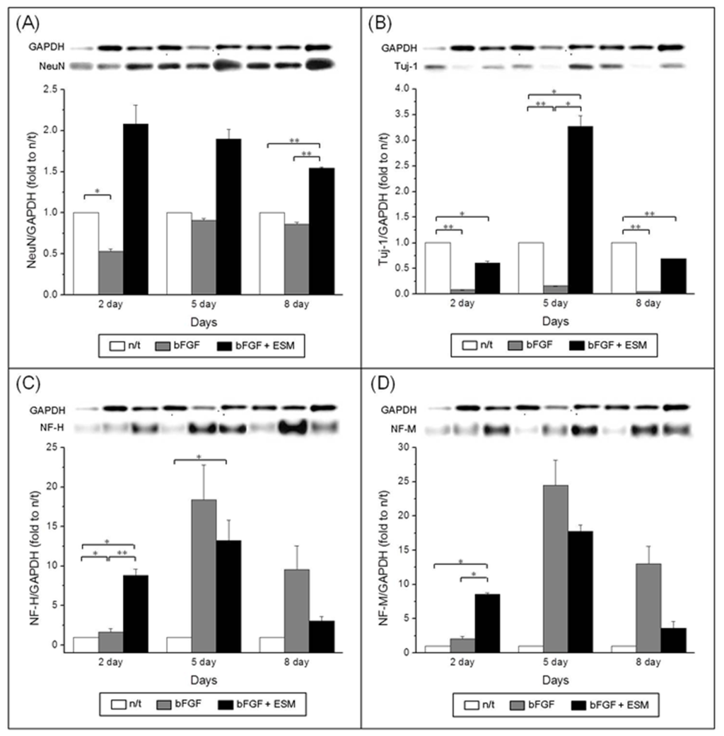 The level of the expressed protein for neuronal markers (A, TuJ1; B, NeuN) and neurofilaments (C, NF-H; D, NF-M) was determined by western blot and evaluated by densitometry. Statistical analysis was performed using a one way-ANOVA with Bonferroni’s multiple comparisons (* p < 0.05, ** p < 0.001).