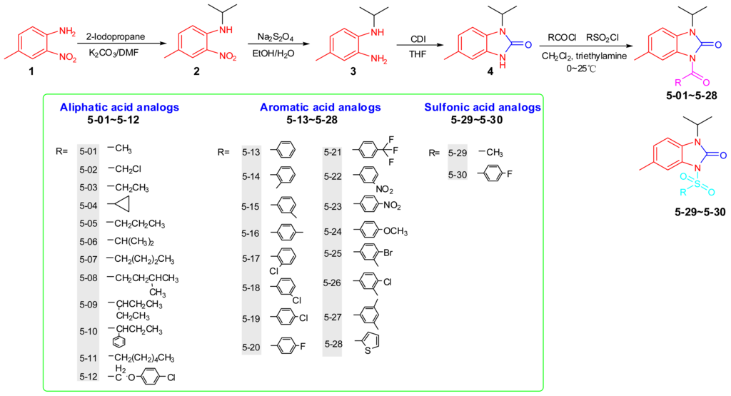 3.2.4. Synthesis of 3-acyl-1-isopropyl-5-methyl-benzimidazolones (5-01~5-30)