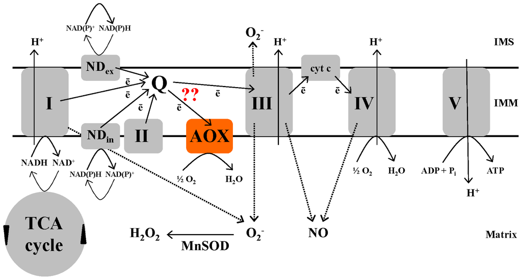 The rate of ROS generation by mitochondria depends upon the reduction state of ETC components. In animals, this reduction state is generally dependent upon the rate of electron transport and the membrane potential, which in turn are primarily dependent upon the rate of dissipation of membrane potential, particularly by oxidative phosphorylation. Hence, when ADP is readily available and being actively phosphorylated to ATP, dissipation of the proton gradient lowers membrane potential and O2− generation is less than when ADP is limiting. In plants, however, the relationship between electron transport, oxidative phosphorylation and ROS generation is more complex because electron flow from ubiquinol to AOX does not contribute to membrane potential. Hence, AOX could provide a means to maintain significant electron flow, even when ADP is limiting, while still preventing the over-reduction of the ETC [,].