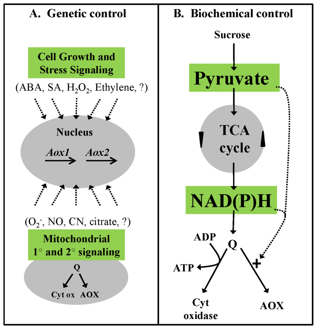 Genetic (a) and biochemical (b) control of AOX respiration in plants. Genetic control of AOX gene expression likely involves both retrograde signals from the mitochondrion and other cellular signals related to growth, energy metabolism and stress. Biochemical control of the partitioning of electrons to AOX is, at least in part, the result of a feed-forward activation of AOX by upstream carbon (pyruvate) and redox (NAD(P)H) status.