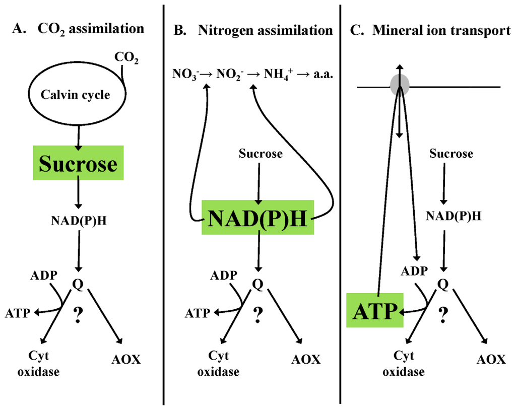 The presence of AOX provides the respiratory system with built-in flexibility regarding the degree of coupling between carbon metabolism pathways, ETC activity, and ATP turnover. Adjustment of the absolute and relative rates of electron flow between AOX and cyt oxidase provides a means to rapidly align cellular demands for ATP with cellular demand for pyridine nucleotide turnover and carbon intermediate supply for biosynthesis. In general terms, this could provide an important mechanism to switch between catabolic and anabolic modes of respiration, as well as providing a general means to control the carbon, energy and redox status of the cell. Below are a few generalized examples to illustrate the potential for AOX to provide such metabolic homeostasis to plant metabolism.