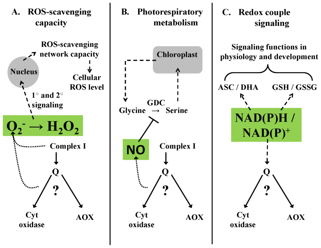 A key contrast may exist between the AOX role to maintain metabolic homeostasis and the AOX role to maintain signaling homeostasis. Unlike metabolic pathways, signaling pathways are often associated with an amplification of the signal by second messengers. Hence, the changes in AOX activity needed to provide signaling homeostasis may be subtle compared to the changes in AOX activity that provide metabolic homeostasis. For example, assuming ETC-generated ROS as an important signal, it has been shown that small changes in electron transport rate or in membrane potential can have a relatively large impact on ROS generation [].