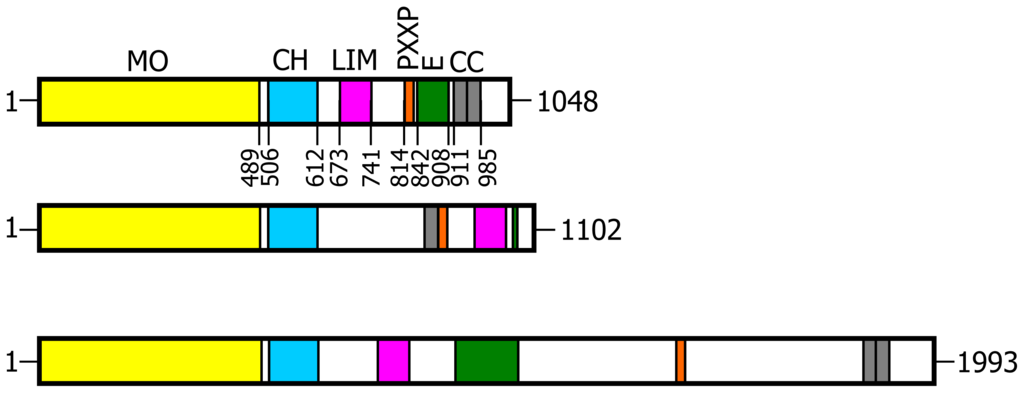 A bioinformatic analysis restricted to human proteins led to establish phylogenetic relations among the so-called class of CH and LIM-containing proteins, which includes MICAL1-3 as well as the LMO7 and LIMCH1 gene products, highlighting a possible common evolutionary origin of these proteins []. The latter proteins are also involved in interactions with actin and actin-binding proteins.