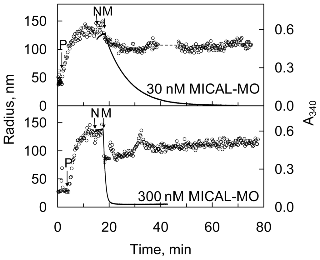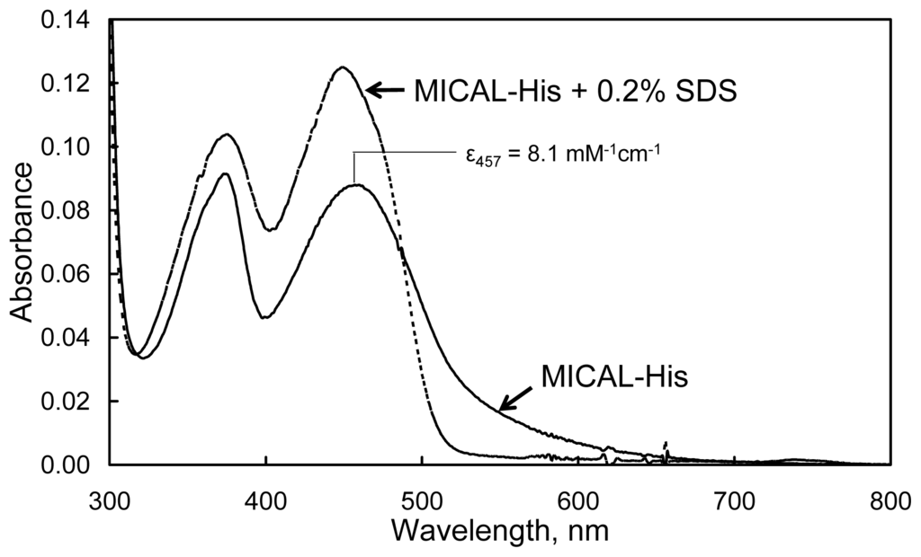 More recently, the monooxygenase domain of human MICAL1 was produced in E. coli cells without or with N- or C-terminal His-tags []. The purified proteins contained stoichiometric amounts of FAD and were indistinguishable from each other with respect to the absorbance and fluorescence spectra and the steady-state kinetic parameters of the NAD(P)H oxidase reaction. Thus, most of the experiments designed to carry out the basic characterization of the protein have been carried out with the most abundant C-terminally His-tagged MICAL-MO form.