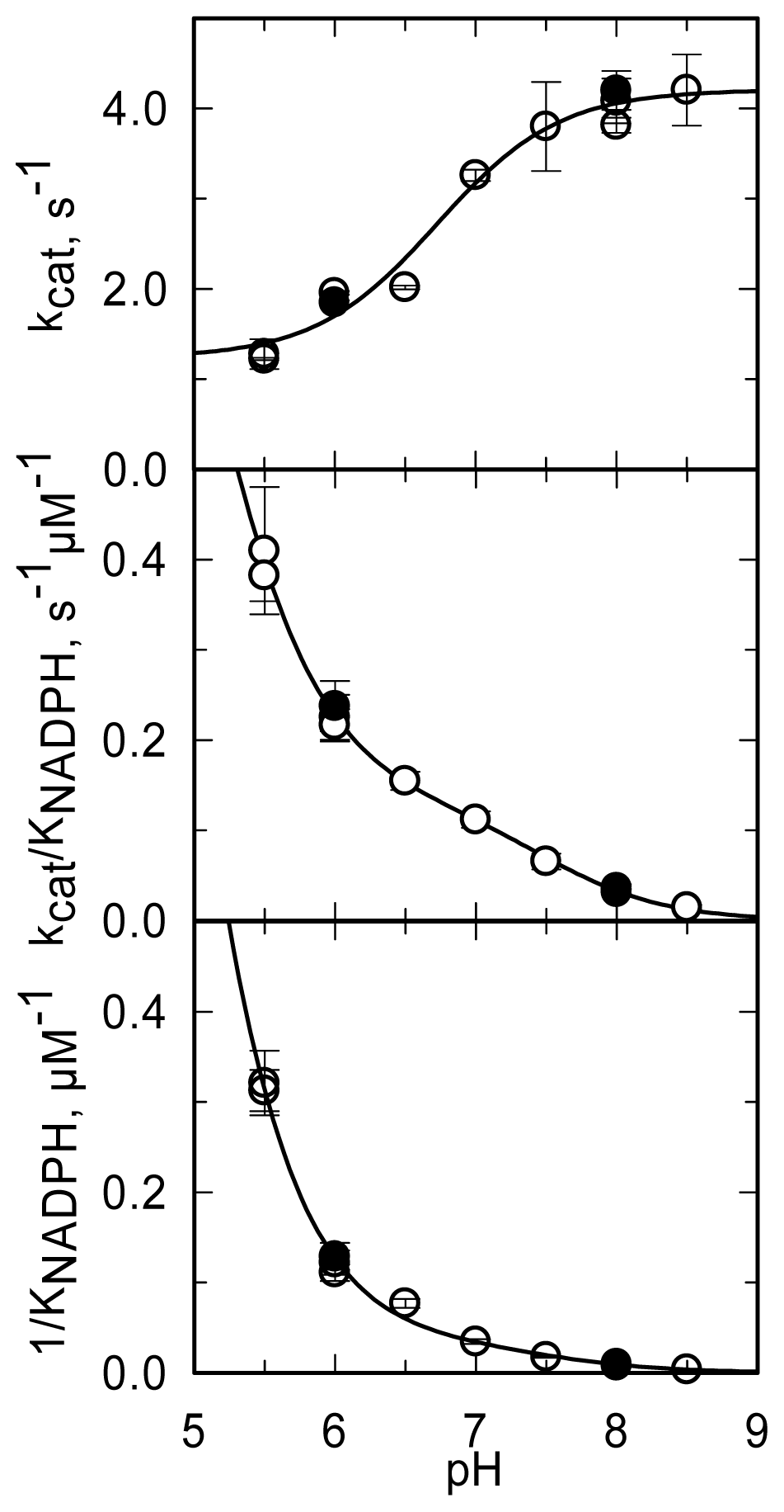 pH dependence of the kinetic parameters of the NADPH oxidase reaction of MICAL-MO. The steady-state kinetic parameters kcat, KNADPH and kcat/KNADPH were measured as described in Table 3, where the values of the calculated parameters are shown. Reprinted from [] with permission from Elsevier.