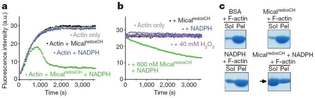 Should MICAL modify a protein side-chain, one of the relevant biological issues would be the reversibility of the modification. Cysteine oxidation leading to formation of disulfides may be reversed by systems like that formed by the thioredoxin/thioredoxin reductase couple [], while methionine oxidation may be reversed by methionine sulfoxide reductases []. Modification of other side chains may require novel enzymatic activities, which would lead to other exciting discoveries.