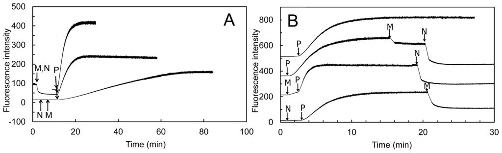 - Wijnands, R.A.; van der Zee, J.; van Leeuwen, J.W.; van Berkel, W.J.; Muller, F. The importance of monopole-monopole and monopole-dipole interactions on the binding of NADPH and NADPH analogues to p-hydroxybenzoate hydroxylase from Pseudomonas fluorescens. Effects of pH and ionic strength. Eur. J. Biochem 1984, 139, 637–644. [Google Scholar]