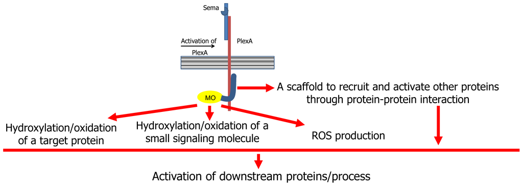 On the basis of the body of current knowledge on MICALs, several hypotheses on its mode of action have been made (Figure 2, [,,]). According to a first hypothesis, MICAL may simply act as a scaffold protein. When the semaphorin (Sema1A in Drosophila, Sema3A in mammals) interacts with its plexin A receptor directly (as in Drosophila) or through the neuropilin coreceptors (in mammals), several proteins are recruited to the (activated) plexin cytoplasmic domain. Among them is MICAL, which interacts with plexin through its C-terminal region (Figure 2, []).