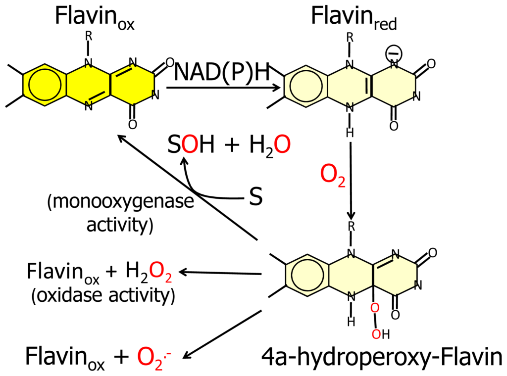 General scheme of the catalytic activities of FAD-dependent monooxygenases (hydroxylases) [,].